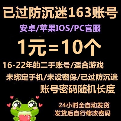 (做过部分游戏)已绑手机/已过防沉迷163邮箱----9成新/账号随机长度/密码相同/未开通POP3/0.2元=1个