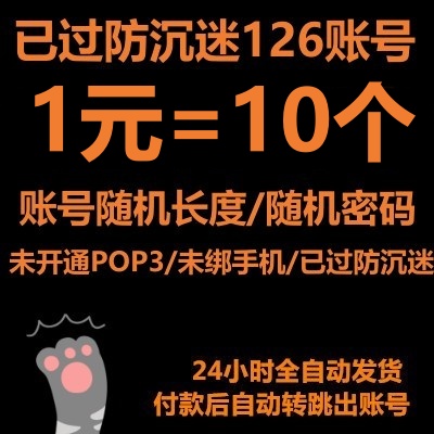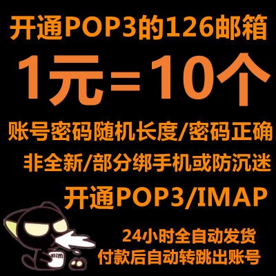 二手邮箱未开通pop3----部分绑手机126邮箱/随机长度/密码正确/1元=250个/最低购买250个/只包密码正确(不包能登上邮箱)