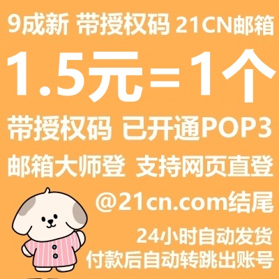 带授权码已开通POP3/9成新21CN邮箱----随机密码/支持邮箱大师直登/支持网页登/已绑手机/21cn.com结尾/做过一两个项目介意勿拍/账号格式:账号----密码(密码也是授权码)